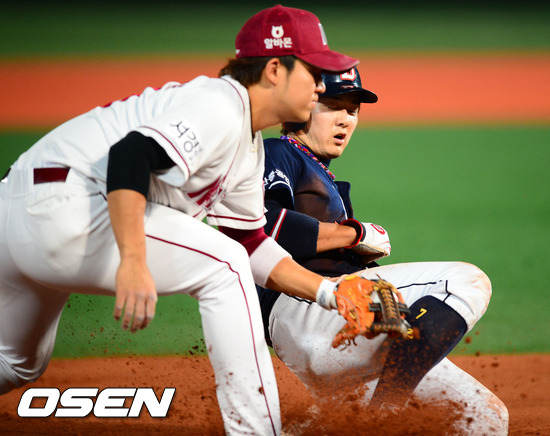 2일 오후 서울 목동구장에서 열린 '2012 팔도 프로야구' 넥센 히어로즈와 두산 베어스의 경기에서 3회초 2사 주자 2루 두산 양의지 타석에서 최주환이 3루에서 견제사를 당하고 있다.