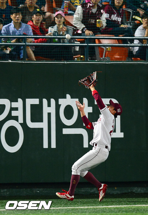 2일 오후 서울 목동구장에서 열린 '2012 팔도 프로야구' 넥센 히어로즈와 두산 베어스의 경기에서 5회초 2사 주자 없는 상황에서 두산 오재원의 플라이 타구를 넥센 좌익수 문우람이 파울라인 안으로 달려 들어가며 잡아내고 있다.
