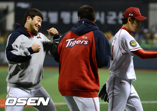 2일 오후 전북 군산구장에서 열린 2012 팔도 프로야구 KIA 타이거즈와 롯데 자이언츠의 경기 3회초 KIA 서재응과 김진우가 더그아웃으로 들어가는 윤석민과 하이파이브 후 장난을 치고 있다.