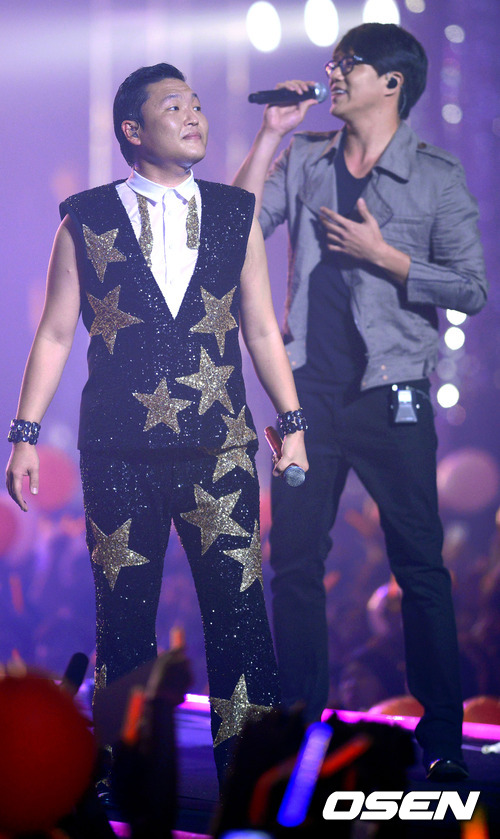 2일 오후 서울 잠실 실내체육관에서 열린 싸이 무료콘서트 'CY×PSY 콘서트 싸이랑 놀자'에서 싸이가 성시경과 듀엣 무대를 선보이고 있다.