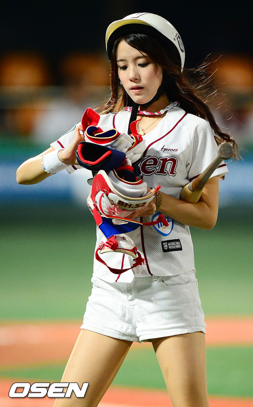 2일 오후 서울 목동구장에서 열린 '2012 팔도 프로야구' 넥센 히어로즈와 두산 베어스의 경기에서 넥센 배트걸 민수진이 보호대와 배트를 들고 달리고 있다.