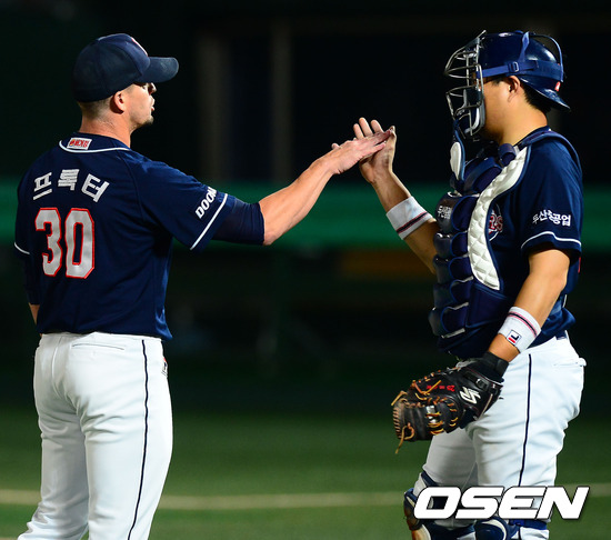 경기를 마치고 두산 프록터와 양의지가 하이파이브를 하고 있다. / rumi@osen.co.kr
