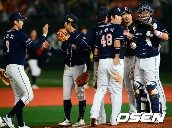경기를 마치고 두산 선수들이 마운드 근처에 모여서 하이파이브를 하고 있다. / rumi@osen.co.kr