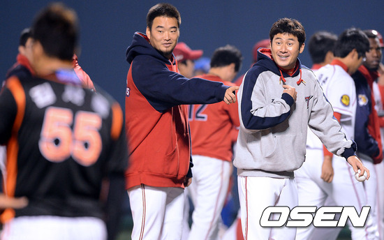 경기 종료 후 KIA 서재응과 김진우가 롯데 선수들에게 축하의 인사를 하고 있다. / soul1014@osen.co.kr