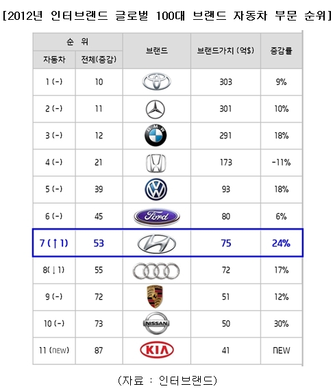현대차가 2012년 글로벌 100대 브랜드 조사에서 브랜드 가치 75억 달러(약 8,2조 원), 글로벌 전체순위 53위에 올랐다. 55위인 아우디를 제치고 자동차 부문 7위로 올라섰다.