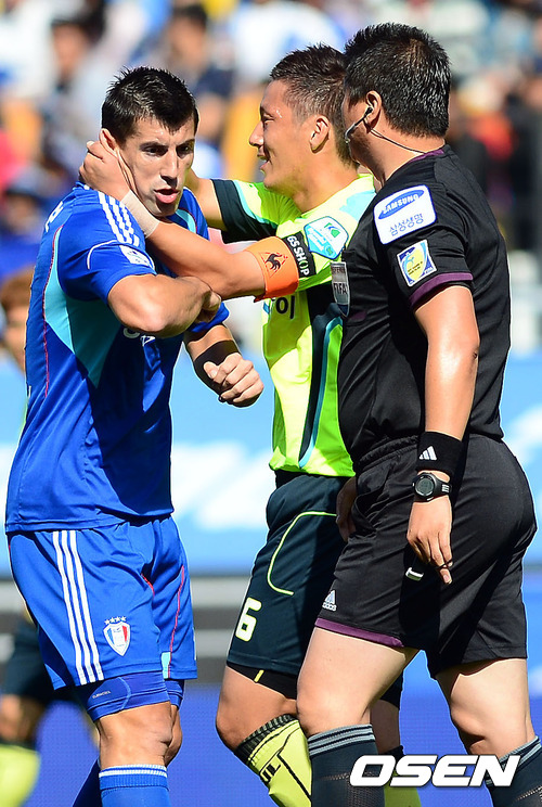 3일 오후 수원월드컵경기장에서 열린 '현대오일뱅크 K리그 2012' 그룹A 34라운드 수원 삼성과 FC 서울의 경기 전반 수원 스테보가 심판의 판정에 항의하려하자 서울 김진규가 스테보를 진정시키고 있다.