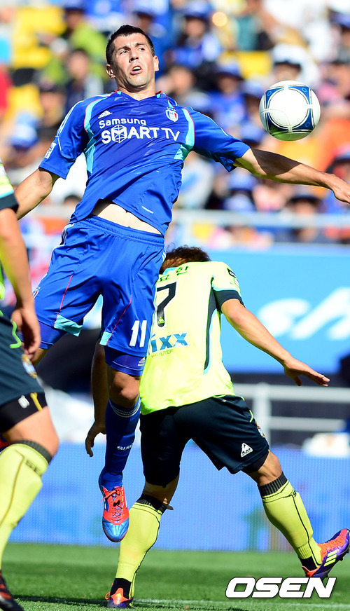 3일 오후 수원월드컵경기장에서 열린 '현대오일뱅크 K리그 2012' 그룹A 34라운드 수원 삼성과 FC 서울의 경기 전반 수원 스테보가 팔을 사용해 공중볼을 잡으려 하고 있다.