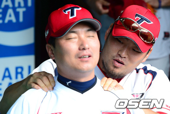 3일 오후 대전 한밭야구장에서 열린 '2012 팔도 프로야구' 한화 이글스와 KIA 타이거즈의 경기에 앞서 KIA 김진우가 정회열 코치에게 안마를 해주고 있다.