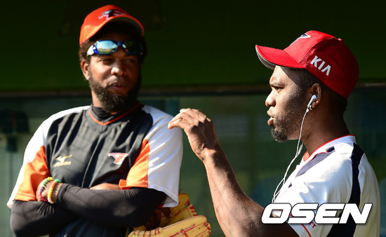 3일 오후 대전 한밭야구장에서 열린 '2012 팔도 프로야구' 한화 이글스와 KIA 타이거즈의 경기에 앞서 KIA 소사가 한화 바티스타와 이야기를 나누고 있다.