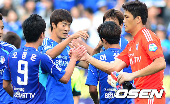 경기 종료 후 수원 오장은과 정성룡이 하이파이브를 하고 있다./youngrae@osen.co.kr