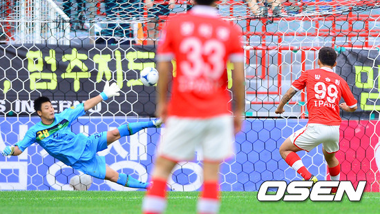 3일 오후 부산 아시아드주경기장에서 열린 현대오일뱅크 K리그 2012 부산 아이파크와 전북 현대의 경기 전반 부산 방승환이 페널티킥으로 선취골을 넣고 있다