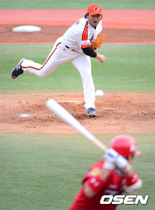 3일 오후 대전 한밭야구장에서 열린 '2012 팔도 프로야구' 한화 이글스와 KIA 타이거즈의 경기, 1회초 한화 선발투수 박찬호가 힘차게 공을 던지고 있다.