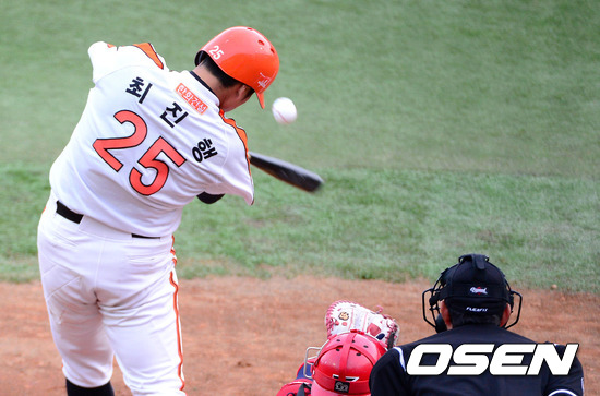 3일 오후 대전 한밭야구장에서 열린 '2012 팔도 프로야구' 한화 이글스와 KIA 타이거즈의 경기, 1회초 1사 3루 한화 최진행이 중전 선제 적시타를 치고 있다.