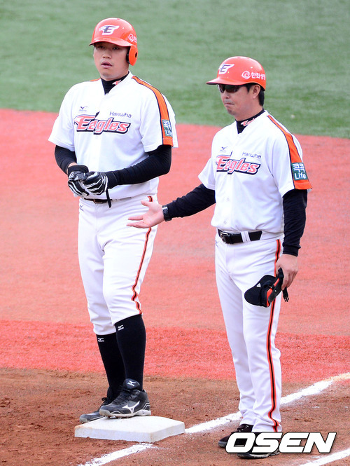3일 오후 대전 한밭야구장에서 열린 '2012 팔도 프로야구' 한화 이글스와 KIA 타이거즈의 경기, 1회초 1사 3루 한화 최진행이 중전 선제 적시타를 치고 장갑을 벗고 있다.