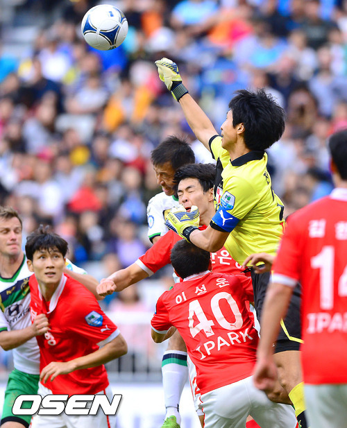 3일 오후 부산 아시아드주경기장에서 열린 현대오일뱅크 K리그 2012 부산 아이파크와 전북 현대의 경기 전반 부산 전상욱 골키퍼가 펀칭하고 있다.