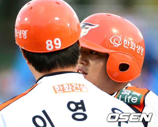 3일 오후 대전 한밭야구장에서 열린 '2012 팔도 프로야구' 한화 이글스와 KIA 타이거즈의 경기, 2회말 무사 2루 한화 박노민이 우전 적시타를 치고 이영우 코치와 이야기를 나누고 있다.