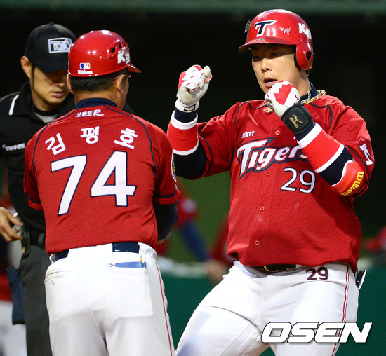 3일 오후 대전 한밭야구장에서 열린 '2012 팔도 프로야구' 한화 이글스와 KIA 타이거즈의 경기, 4회초 1사 2루 KIA 나지완이 투런홈런을 치고 김평호 코치와 하이파이브를 하고 있다.