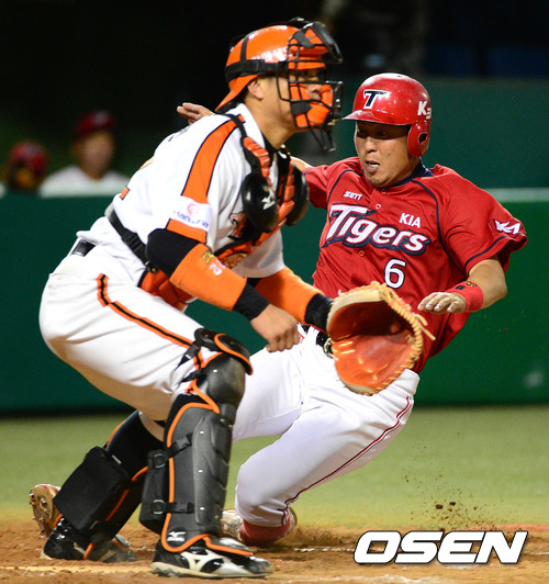 3일 오후 대전 한밭야구장에서 열린 '2012 팔도 프로야구' 한화 이글스와 KIA 타이거즈의 경기, 5회초 1사 2,3루 KIA 김선빈의 희생플라이때 3루주자 박기남이 홈으로 쇄도해 득점에 성공하고 있다.