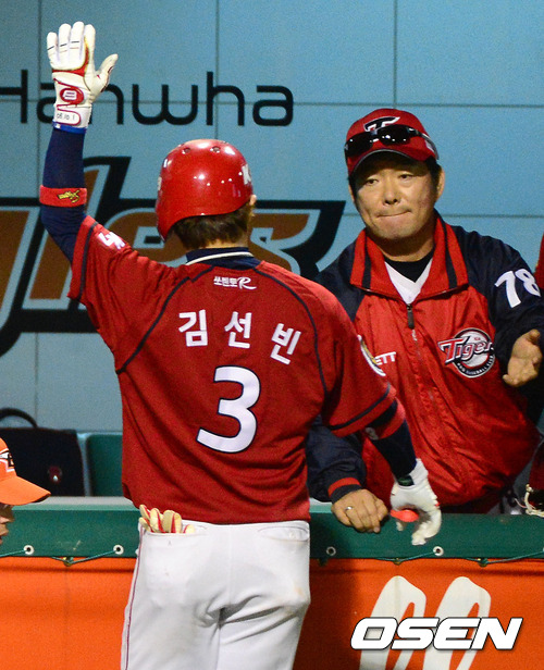 3일 오후 대전 한밭야구장에서 열린 '2012 팔도 프로야구' 한화 이글스와 KIA 타이거즈의 경기, 5회초 1사 2,3루 KIA 김선빈이 희생플라이를 치고 더그아웃에서 이순철 코치의 축하를 받고 있다.