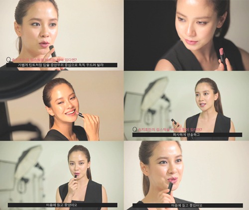 한편, 동영상 속 송지효의 립스틱은 색조 전문 브랜드 '바비 브라운'의 신개념 매트 립스틱 ‘크리미 매트 립칼라’이며, 인터뷰에서 송지효는 가장 맘에 드는 립스틱 컬러로 톤다운된 보랏빛이 감도는 ‘토니 핑크’를 꼽았다.