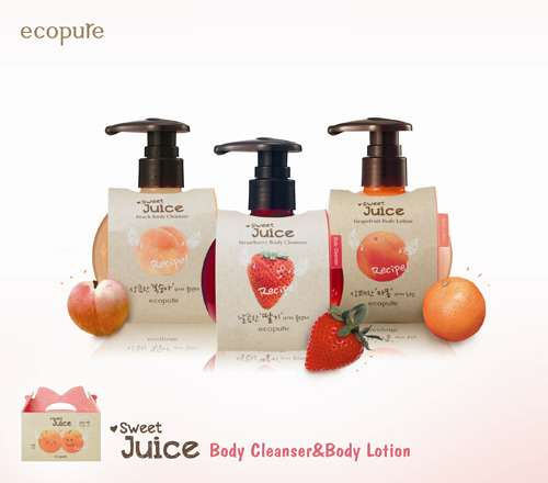 에코퓨어 스위트 주스 바디 라인은 딸기, 복숭아, 자몽 성분이 들어간 주스 콘셉트의 보디 케어 제품 총 6종(바디클렌저 3종, 바디로션 3종)으로 구성됐다. 각 과일마다의 독특한 효능으로 보디피부를 한층 생기 있고 촉촉하게 가꿔주며, 상큼 달콤한 과일 향기가 사용 후 기분까지 상쾌하게 만들어주는 것이 특징이다.
