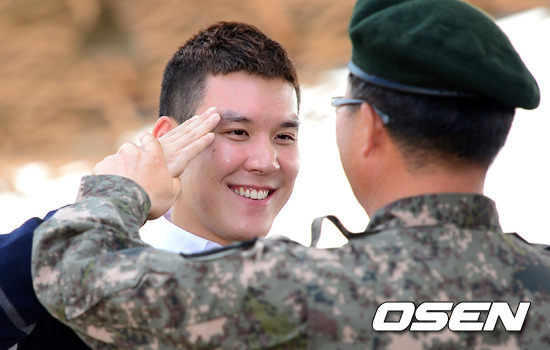 박태환이 군관계자의 도움을 받으며 거수경례를 하고 있다.