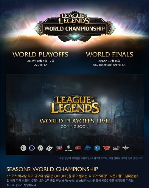 리그 오브 레전드의 세계 대회인 시즌2 월드 챔피언쉽의 플레이오프 및 파이널 경기를 앞두고 라이엇게임즈가 각 경기를 실시간으로 시청할 수 있는 특별페이지를 오픈했다.