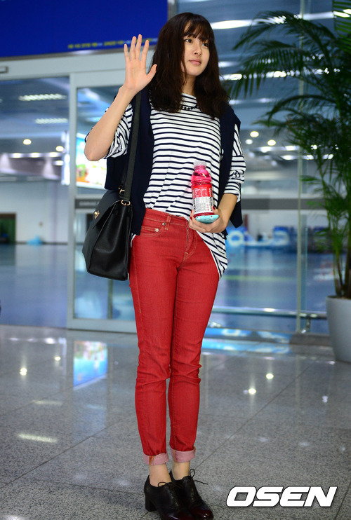 4일 오후 제17회 부산국제영화제(BIFF) 참석을 위해 김해공항에 도착한 강소라가 취재진들을 향해 손을 흔들고 있다.
