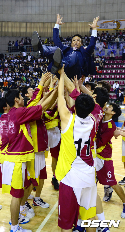 경희대 선수들이 최부영 경희대 감독을 헹가래 치고 있다. / youngrae@osen.co.kr