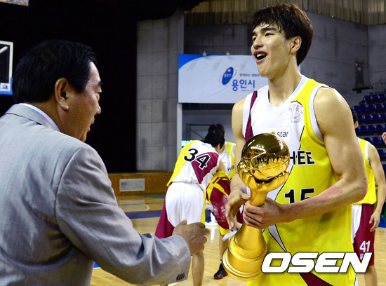 경희대 김종규가 선수 대표로 트로피를 전달받고 있다. / youngrae@osen.co.kr