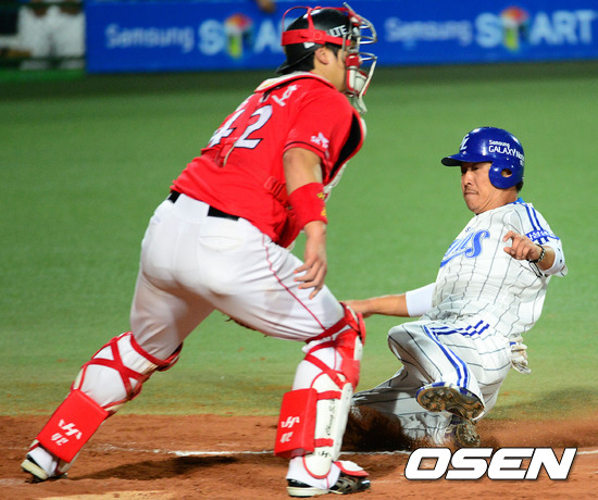 4일 오후 대구야구장에서 열린 '2012 팔도 프로야구' 삼성 라이온즈와 SK 와이번스의 경기, 7회말 2사 2루 삼성 배영섭의 중전 동점 적시타때 2루주자 신명철이 홈으로 쇄도해 득점에 성공하고 있다.