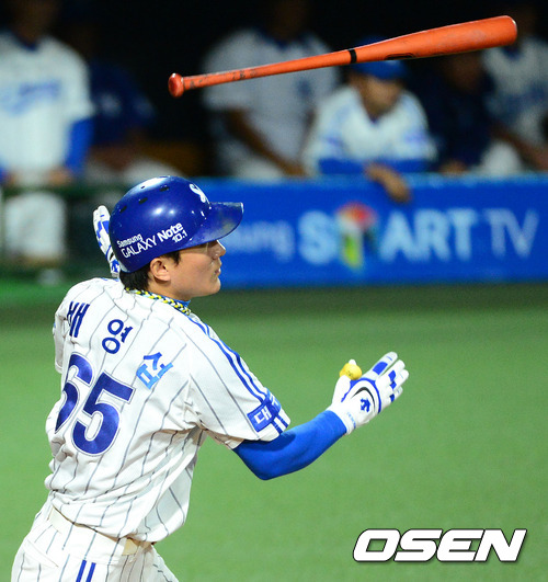 4일 오후 대구야구장에서 열린 '2012 팔도 프로야구' 삼성 라이온즈와 SK 와이번스의 경기, 7회말 2사 2루 삼성 배영섭이 중전 동점 적시타를 치고 있다.