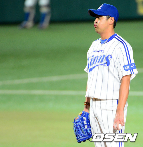4일 오후 대구야구장에서 열린 '2012 팔도 프로야구' 삼성 라이온즈와 SK 와이번스의 경기, 8회초 2사 2루 삼성 장원삼이 SK 최윤석에게 좌전 적시타를 허용하고 아쉬워하고 있다.