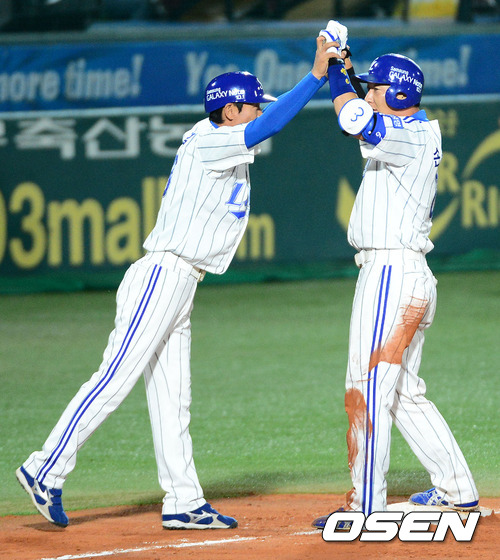 4일 오후 대구야구장에서 열린 '2012 팔도 프로야구' 삼성 라이온즈와 SK 와이번스의 경기, 8회말 2사 만루 삼성 손주인이 싹쓸이 3타점 적시타를 치고 환호하고 있다.