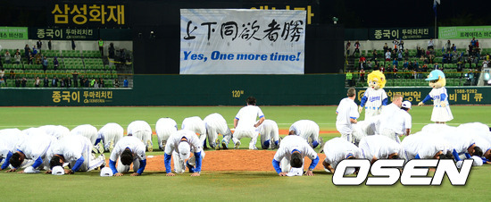 경기 종료 후 류중일 감독을 비롯한 삼성 선수들이 관중석을 향해 절을 하고 있다. / sunday@osen.co.kr
