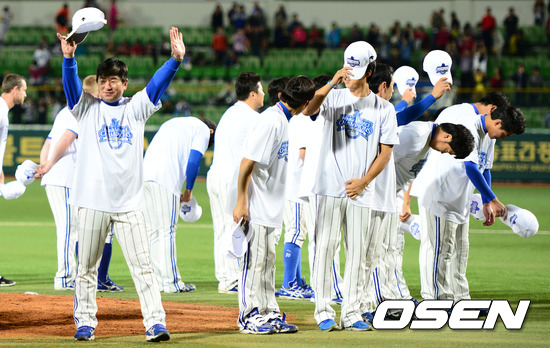 경기 종료 후 류중일 감독을 비롯한 삼성 선수들이 관중석을 향해 인사를 하고 있다. / sunday@osen.co.kr