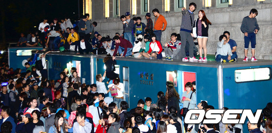 '강남스타일'로 세계적인 인기를 누리고 있는 싸이의 무료공연이 4일 오후 시청 앞 광장에서 열리는 가운데 시민들이 공연을 관람하기위해 공중화장실 지붕에 오르고 있다.