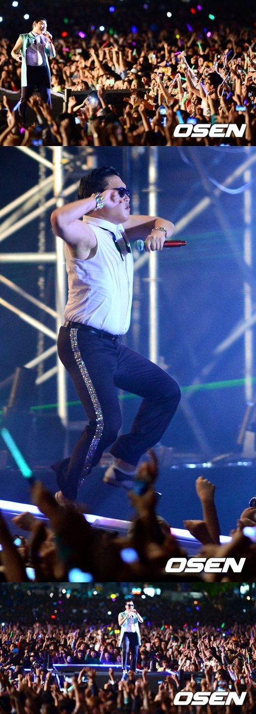 그는 관객에게 지루할 틈을 주지 않고 끊임없이 호응을 유도하며 곡 '낙원', '여러분'을 불렀다. 이후 곡 '강남스타일'의 전주가 흘러나왔고 사람들의 함성은 절정에 이르렀다. 특히 외국인들은 어눌한 발음으로 '강남스타일'을 연호하며 크게 환호하는 모습을 보였다.