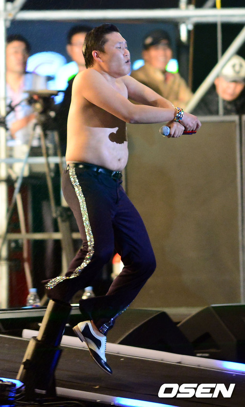 '강남스타일'로 세계적인 인기를 누리고 있는 싸이의 무료공연이 4일 오후 시청 앞 광장에서 열려 싸이가 팬들과의 약속을 지키기 위해 상의 탈의한 채 말춤을 선보이고 있다.