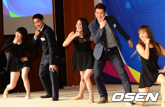 펜싱 김정환 구본길이 축하무대 도중 싸이의 '강남스타일' 안무 포즈를 취하고 있다.