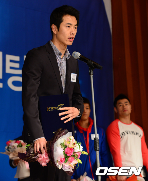 탁구 주세혁이 연금 증서를 받고 소감을 말하고 있다.