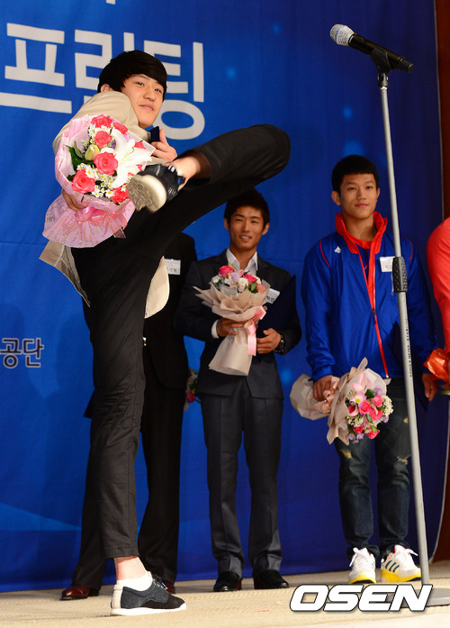 태권도 이대훈이 사회자의 요청으로 발차기를 선보이고 있다.