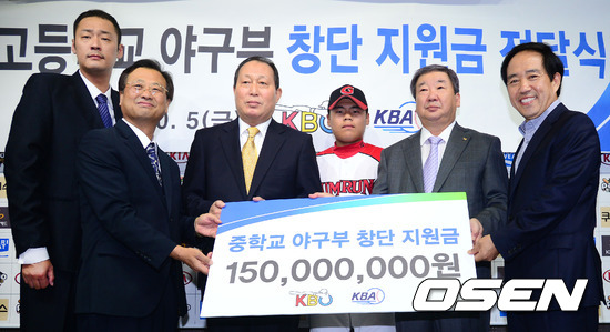 이날 행사에는 각 교의 교장, 야구부장, 감독, 주장, 학부모 대표가 참석하며 KBO 구본능 총재와 KBA 강승규 회장, 김인식 초중고교 창단추진위원회 위원장에게 지원금을 전달받았다. / youngrae@osen.co.kr