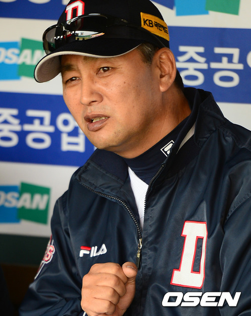 5일 오후 서울 잠실구장에서 열린 '2012 팔도 프로야구' 두산 베어스와 넥센 히어로즈의 경기, 경기전 두산 김진욱 감독이 더그아웃에서 취재진과 이야기를 나누고 있다.