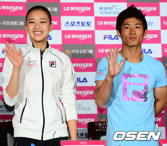 5일 오후 일산 킨텍스 신관 특설무대에서 열린 ‘LG휘센 리드믹올스타즈 2012’ 공개 리허설에서 손연재와 양학선이 손인사를 하고 있다.