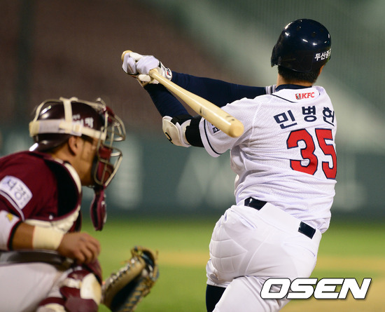 5일 오후 서울 잠실구장에서 열린 '2012 팔도 프로야구' 두산 베어스와 넥센 히어로즈의 경기, 1회말 무사에서 경찰청을 제대한 두산 민병헌이 1번 선발타자로 나서 삼진을 당하고 있다.