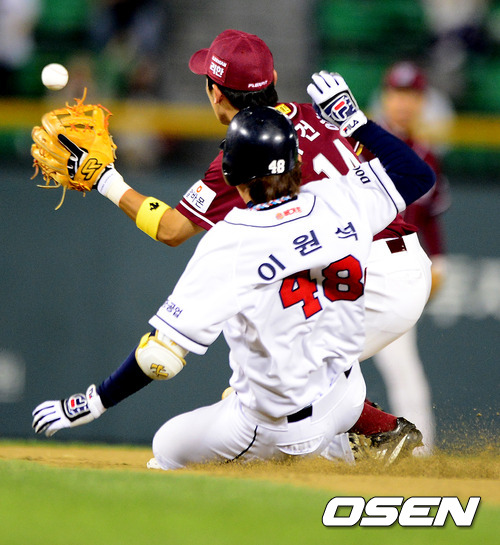 5일 오후 서울 잠실구장에서 열린 '2012 팔도 프로야구' 두산 베어스와 넥센 히어로즈의 경기, 7회말 2사에서 두산 이원석이 2루타를 날리고 넥센 서건창의 태그에 앞서 세이프되고 있다.