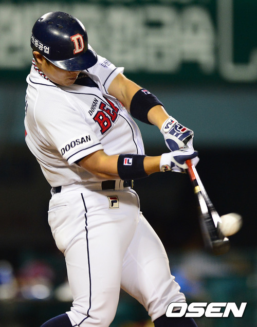 5일 오후 서울 잠실구장에서 열린 '2012 팔도 프로야구' 두산 베어스와 넥센 히어로즈의 경기, 8회말 2사 1루에서 두산 윤석민이 1타점 적시 2루타를 날리고 있다.