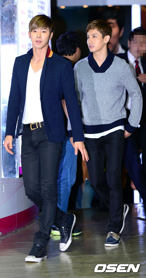 5일 오후 서울 코엑스에서 진행된 동방신기 신규 앨범 출시기념 팬 사인회에 유노윤호와 최강창민이 입장하고 있다.