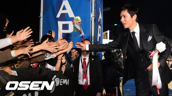 5일 오후 부산 해운대 백사장에서 열린 '제 17회 부산국제영화제(BIFF)' APAN 스타로드 블루카펫 행사에서 김민종이 팬들에게 꽃을 건내고 있다.